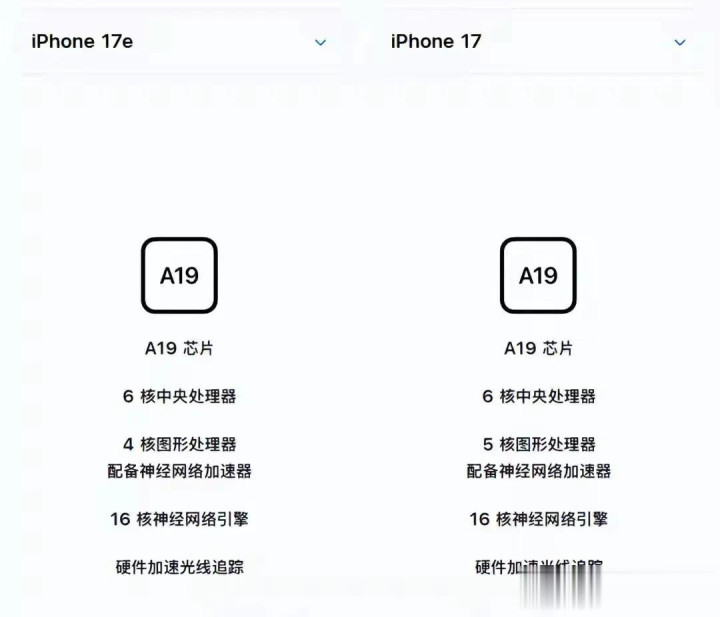 iPhone 17e最大的亮点在于内核确立。它搭载了苹果最新的A19芯片,存储径直从256GB起步。 这一确立组合让初学机型领有了旗舰级的性能证实,娇傲出苹果在中枢硬件上的赤心。仔细谋划便会发现其中的精妙平衡。iPhone 17e搭载的A19芯片是“6+4”的弟中弟版块,对比iPhone 17模范版的“6+5”A19,当众砍了一刀GPU。 苹果在性能确立上的精确刀法再次娇傲,既知足了“搭载最新芯片”的营销需求,又确保了与模范版的等第各别。