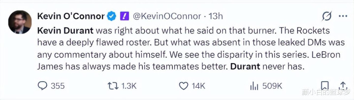 NBA记者凯文-奥康纳重提杜兰特疑似小号事件,他暗示那封邮件也有正确的,火箭队声威的确独特无理,从系列赛能看出詹姆斯不错让队友变好,而杜兰特却从未作念到这极少。
