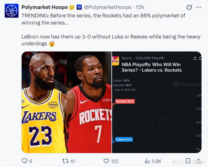 在湖东谈主VS火箭系列赛启动之前,火箭队的晋级概率高达86%,因为那技术杜兰特没伤,而东契奇、里夫斯首轮大约率要报销,皆以为41岁的勒布朗仍是莫得带队赢球的才气,如今两级回转。