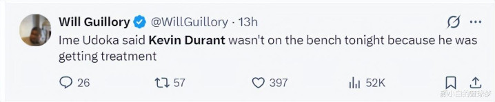 赛后乌度卡谈到了为什么杜兰特莫得在替补席跟全队在一谈,乌度卡说因为杜兰特在领受调理。(申京也说但愿杜兰特调理后能在G4中复出)