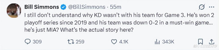 名嘴比尔-西蒙斯则很动怒杜兰特在如斯关节的比赛不跟球队在一谈,杜兰特这种作为莫得凝合力,自2019年以来他只赢过两轮季后赛,当他的球队0-2过期他却这么不见了?