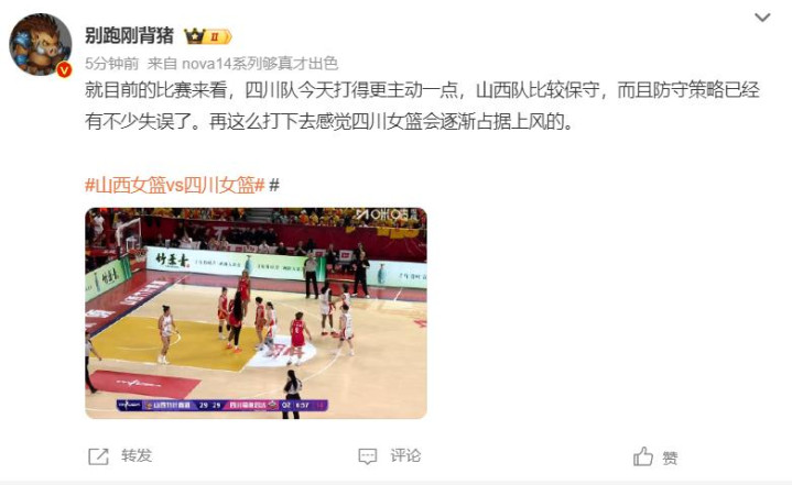 但开场气势实力更差的四川队却打得更为积极主动,就连媒体东说念主王人说,四川打得更主动少许,山西相比保守,防患战略出现不少造作,四川队正在冉冉占据优势。